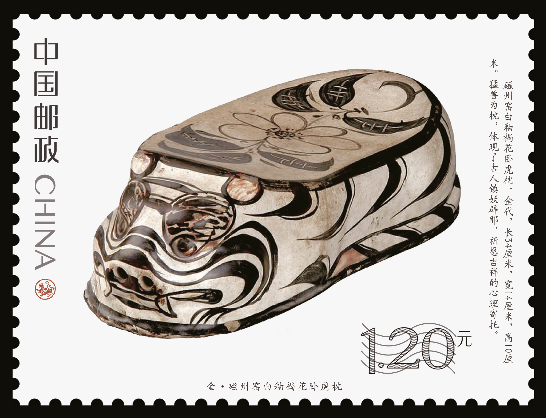 9月5日,由中國郵政特別制作的《虎文物》特種郵票正式發(fā)行。此套郵票共有6枚,每枚上都印有一件珍貴的虎文物。郵票圖案名稱分別為“商·伏鳥雙尾青銅虎”“春秋·青玉虎形佩”“漢·白虎瓦當”“漢·錯金銘文銅虎節(jié)”“金·磁州窯白釉褐花臥虎枕”“清·皮影飛虎”。其中第五枚郵票圖案中的“金·磁州窯白釉褐花臥虎枕”就是來自周口市博物館的珍貴文物。