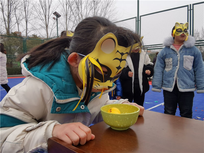 活動現(xiàn)場,一條條燈謎掛在繩上供大家思考,猜出謎底的“虎娃”開心地把燈謎撕下來找工作人員兌換獎品,玩得不亦樂乎。同時,元宵節(jié)的傳統(tǒng)食物元宵也出現(xiàn)在活動中,社工、志愿者設(shè)置的團團圓圓(歡樂夾元宵)游戲,用乒乓球代替元宵,讓“虎娃”們進行大比拼,大家從剛開始的不熟悉變?yōu)楹髞碓絹碓侥?,現(xiàn)場其樂融融。隨后,聲聲報福(踩氣球)游戲?qū)⒒顒油葡蚋叱薄?/p>