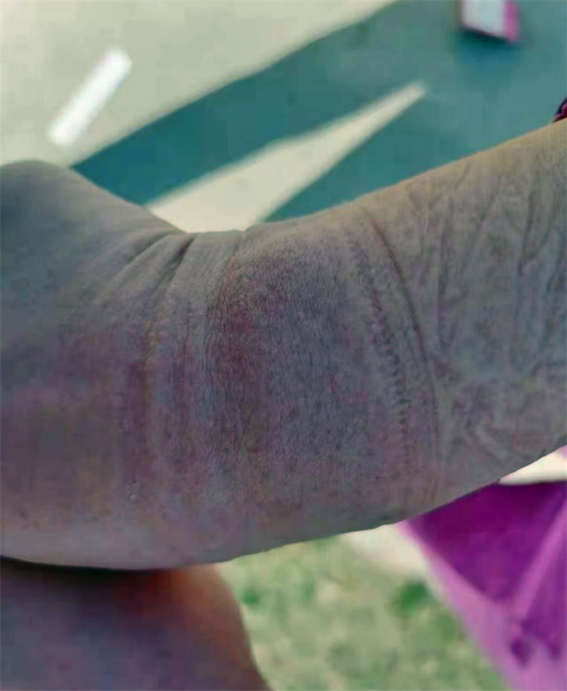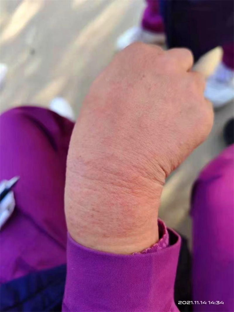 手部出現(xiàn)嚴重過敏反應,局部出現(xiàn)紅腫、皮疹癥狀