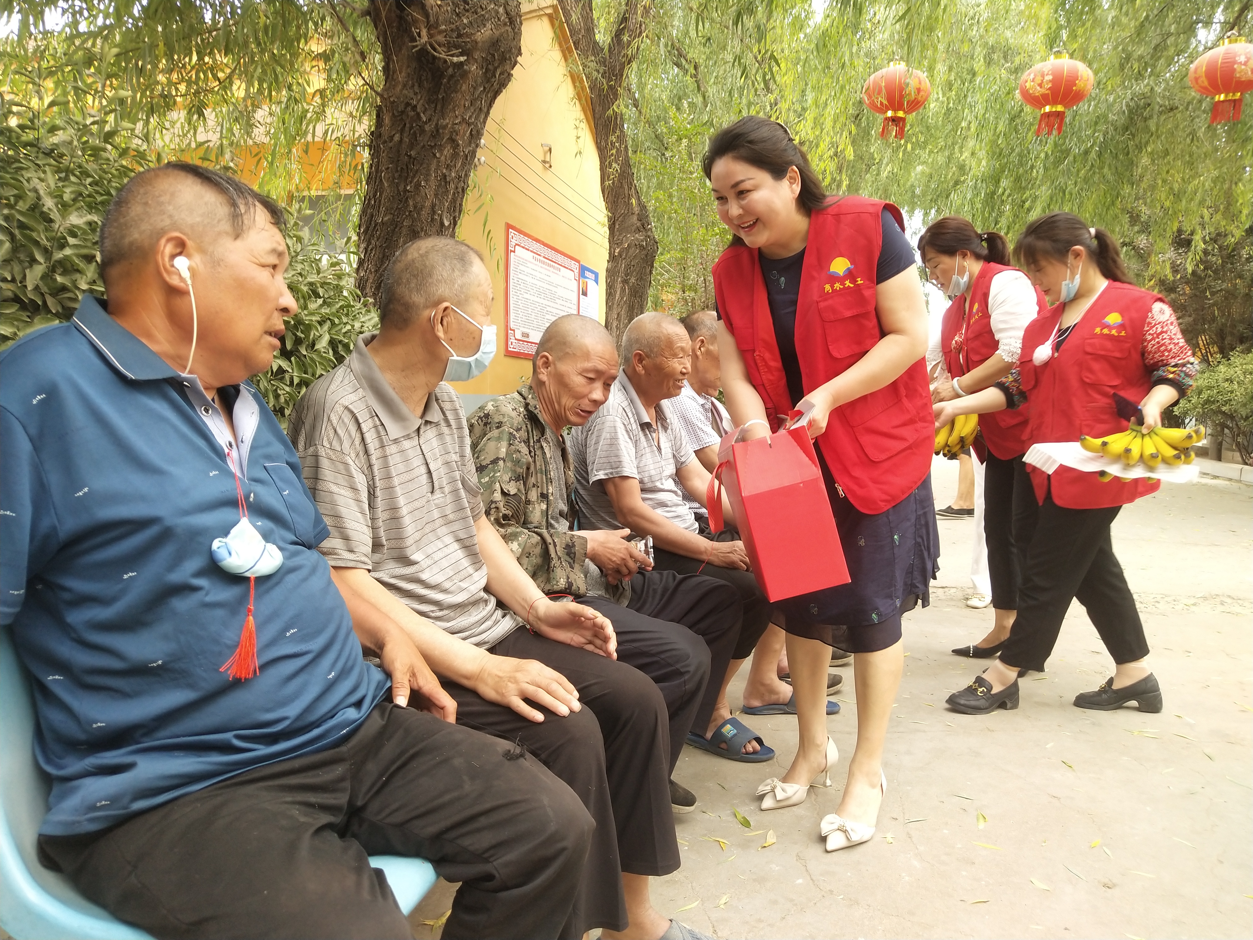 “大爺,大娘,來(lái)吃水果,我把香包給您戴上,祝您端午安康,健康長(zhǎng)壽......”劉玉英委托的愛(ài)心志愿者戚素華、劉影、袁鳳蓮、李霞、姚君英、李艷紅、王香清等還給敬老院的老人送來(lái)了粽子、水果,和老人聊天交談、佩戴香包,老人們臉上綻開了幸福的笑容。