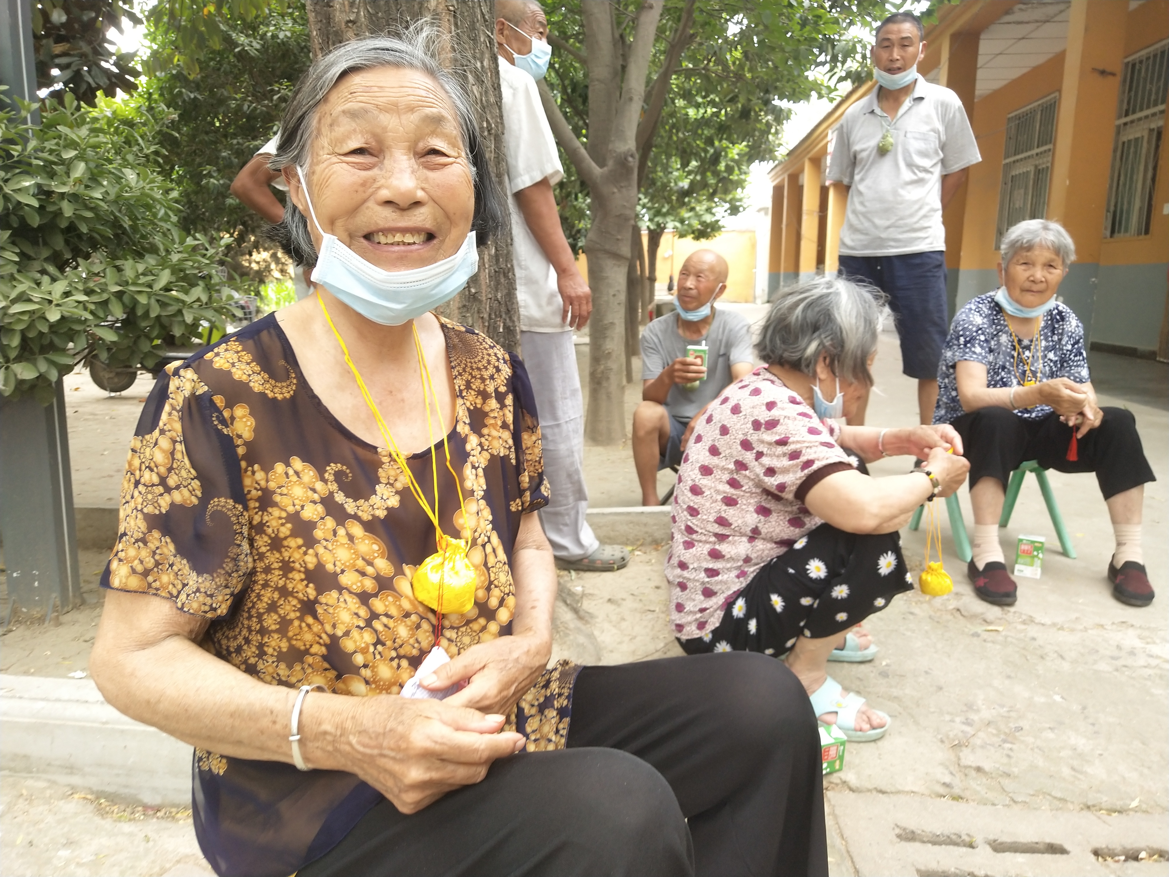 “來(lái),來(lái),來(lái),這是玉英從江蘇省南通市給咱郵寄過(guò)來(lái)的香包,今天過(guò)節(jié)哩,大家每人帶上一個(gè),祝愿大家胸前飄香,端午安康!”