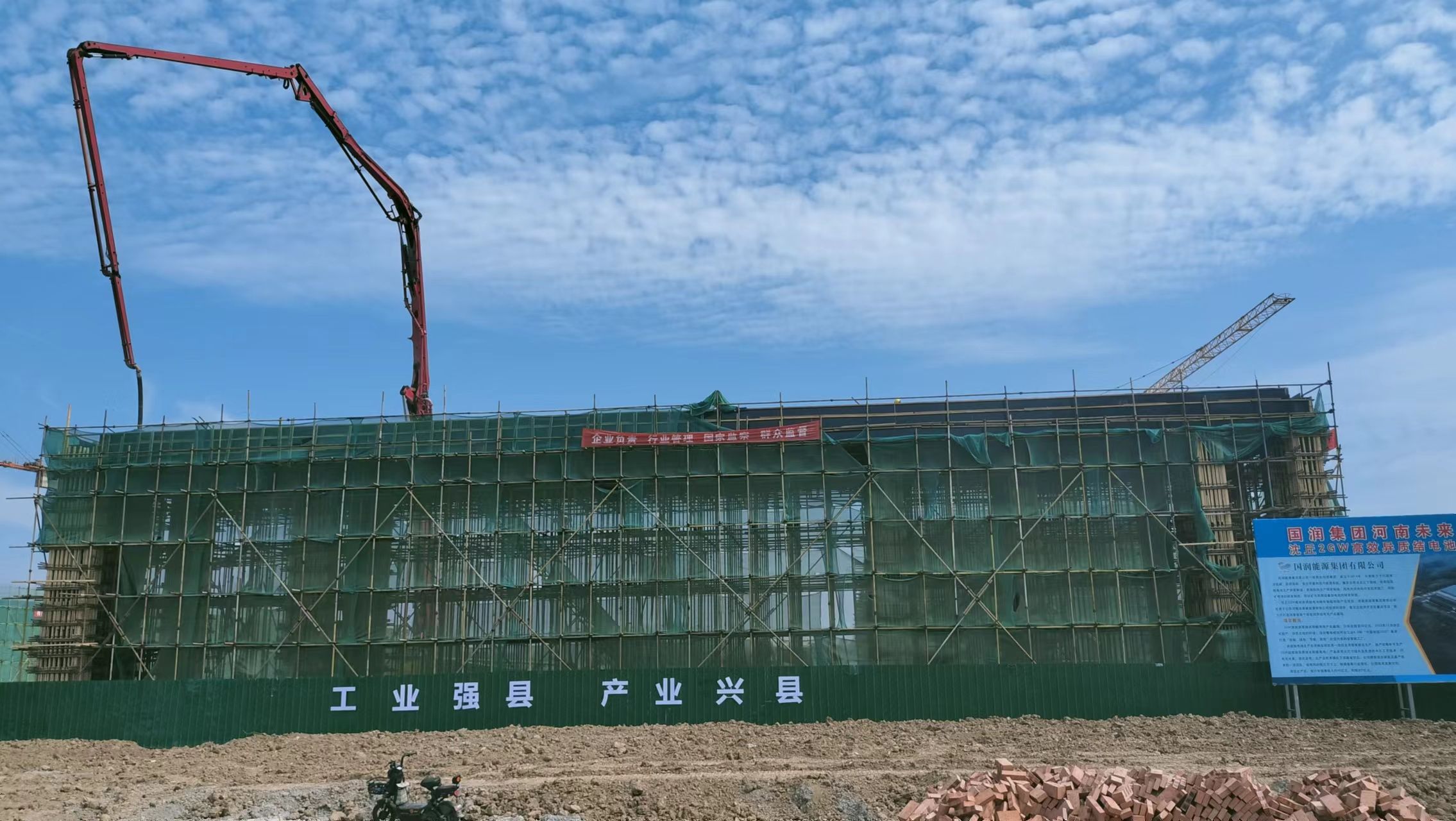 離開標(biāo)準(zhǔn)化廠房建設(shè)工地,記者又來到位于沈丘縣現(xiàn)代科技產(chǎn)業(yè)園內(nèi)的河南未來新能源沈丘2GW高效異質(zhì)結(jié)(HJT)電池綠色智能制造項(xiàng)目工地,那里也是塔吊林立,一片繁忙景象。高端電池生產(chǎn)車間正在緊張施工中,一臺(tái)灌漿機(jī)正在澆筑房頂。項(xiàng)目部負(fù)責(zé)人張旭輝說:“正在建設(shè)的是高端太陽能芯片生產(chǎn)車間主廠房面積2.41萬平方米,鋼架5200平方米,10月底完工,11月份安裝設(shè)備?!?/p>