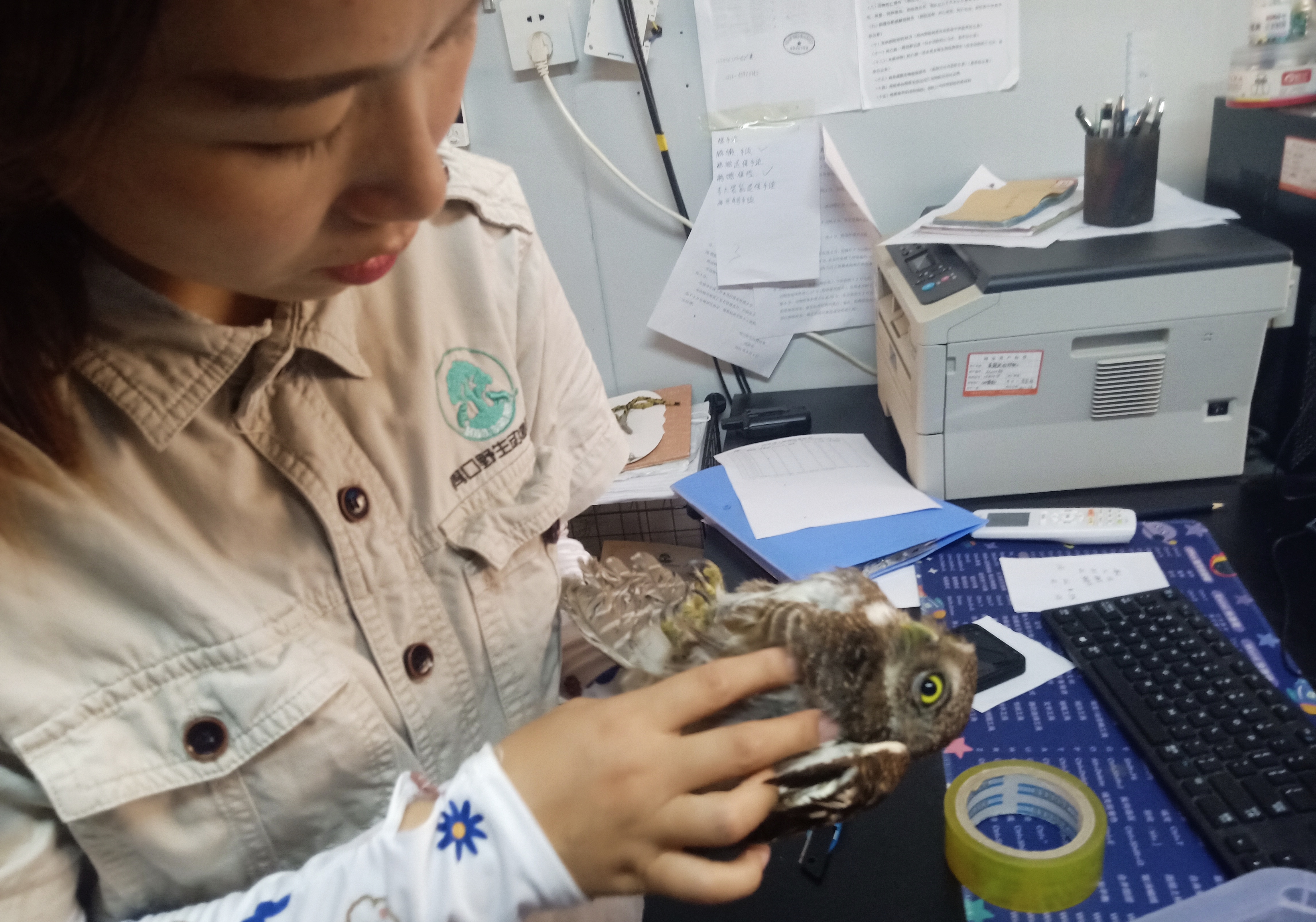 8月14日9時許,天氣炎熱,項城市公安局水寨派出所一民警駕車來到項城市自然資源和規(guī)劃局,向野生動物保護人員張向忠現(xiàn)場移送一只受傷的斑頭鵂鹠。
