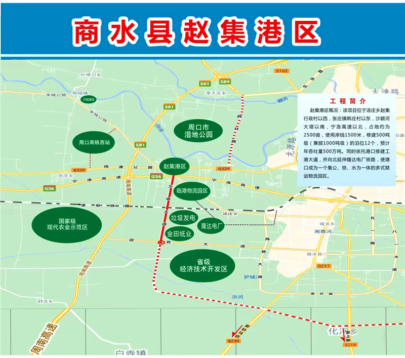 2017年,商水縣政府按照前瞻30年、謀劃15年、做實(shí)近5年工作要求,開始規(guī)劃修建位于湯莊鄉(xiāng)趙集行政村以西,張莊鎮(zhèn)韓莊村以東,沙潁河大堤以南,寧洛高速以北的趙集作業(yè)區(qū)。規(guī)劃建設(shè)占地約720畝、總投資6.37億元的趙集港項(xiàng)目,同時(shí)修建12個(gè)1000噸級(jí)泊位,其中散貨泊位8個(gè),通用泊位2個(gè),多用途泊位2個(gè),占用岸線1250米,預(yù)計(jì)年吞吐量達(dá)475萬噸。碼頭采用順岸式布置,結(jié)構(gòu)采用重力式扶壁結(jié)構(gòu),前沿配置30噸門座式固定吊裝卸作業(yè)。港口涵蓋貨物拆解區(qū)、散件堆放區(qū)等4個(gè)功能區(qū),集裝箱露天堆場(chǎng)、大型貨車停車場(chǎng)等5個(gè)場(chǎng)地。圍繞趙集港,高標(biāo)準(zhǔn)規(guī)劃建設(shè)占地約6.2平方公里的多式聯(lián)運(yùn)臨港經(jīng)濟(jì)園區(qū),下設(shè)金田紙業(yè)、建材倉儲(chǔ)兩個(gè)物流園區(qū),涵蓋建材及建材制品園區(qū)、造紙業(yè)原料及成品園區(qū)、紡織服裝原料及成品園區(qū)3個(gè)功能園區(qū)。該項(xiàng)目建成投入使用后,不但能加快商水縣紡織園區(qū)、循環(huán)園區(qū)、經(jīng)濟(jì)開發(fā)區(qū)、隆達(dá)電廠等企業(yè)物質(zhì)的流轉(zhuǎn),而且能使商水港成為周口沙潁河重要的鐵運(yùn)、陸運(yùn)、水運(yùn)交通樞紐、貨物貿(mào)易和物流中轉(zhuǎn)聚集區(qū),從而進(jìn)一步促進(jìn)商水經(jīng)濟(jì)的健康、快速發(fā)展。