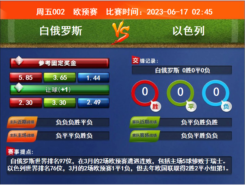 比賽時間:2023-06-17 02:45賽事提點:白俄羅斯世界排名97位,在3月的2場歐預(yù)賽遭遇連敗,包括主場5球慘敗于瑞士。以色列世界排名76位,3月的2場歐預(yù)賽1平1負(fù),但去年歐國聯(lián)取得2勝2平小組第1。