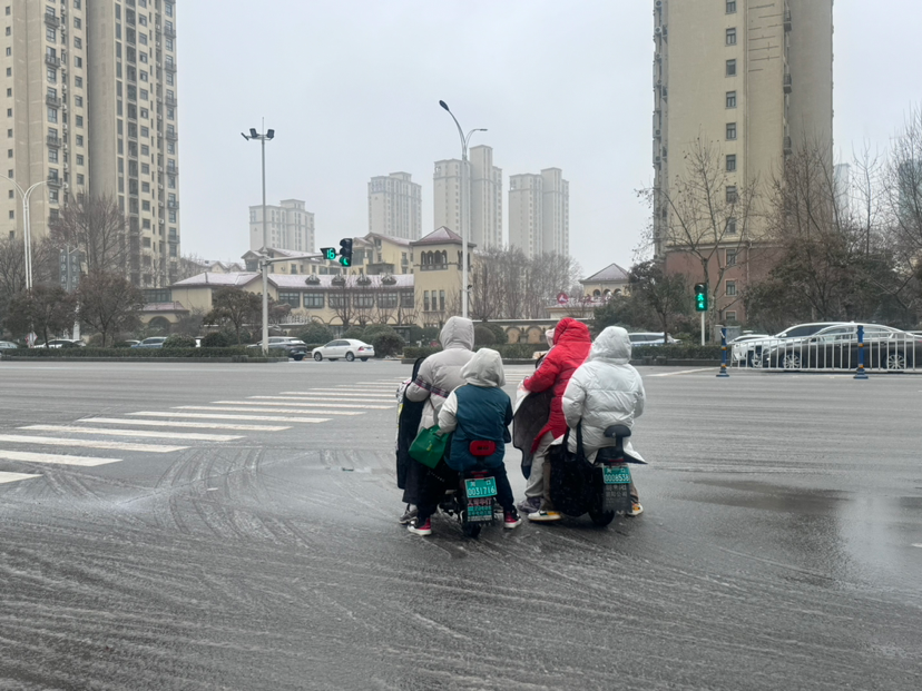 記者在周口大道看到,過往車輛紛紛拉開車距、緩慢通行,騎電動(dòng)車的市民大多戴上了帽子、裹緊了身上的棉衣,過往行人撐著雨傘、頂著寒風(fēng)匆匆趕路。