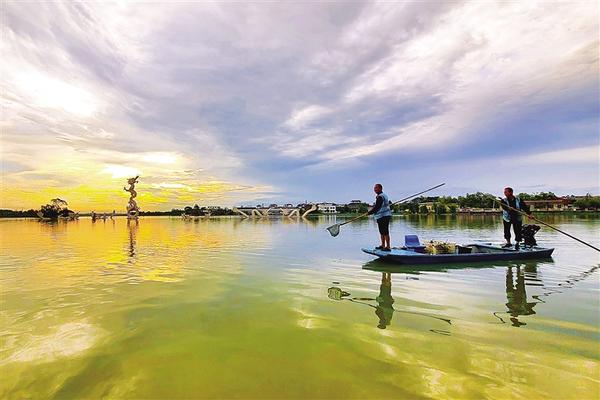 8月13日,當?shù)谝豢|晨光穿過云層,水云間的淮陽萬畝龍湖景色怡人。此時,一艘打撈船也開始“搜尋”湖面漂浮的垃圾。正在晨練的一位市民說:“正是環(huán)衛(wèi)工人日復(fù)一日、年復(fù)一年默默無聞的工作,才換來我們身邊美好的生活環(huán)境,他們才是最美的風景?!庇浾?杜欣 攝