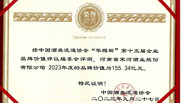 [鹿邑]宋河酒業(yè):2023年度品牌價值為155.34億元