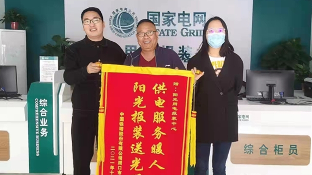 近日,在國網(wǎng)周口供電公司陽光報裝中心,中國鐵塔股份有限公司周口分公司業(yè)務(wù)經(jīng)理朱義嶺一邊將印有“供電服務(wù)暖人心 陽光報裝送光明”的錦旗遞給供電工作人員,一邊感謝該公司對鐵塔基站建設(shè)提供的支持。