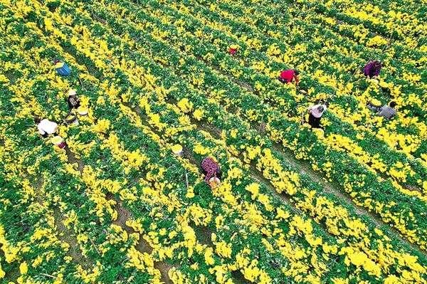 11月13日,項(xiàng)城市新橋鎮(zhèn)南趙村村民在田間采摘金絲皇菊。剛剛離枝的新鮮菊花隨即被送往村里的加工車(chē)間烘干,之后由專(zhuān)業(yè)合作社統(tǒng)一收購(gòu)并對(duì)外銷(xiāo)售。