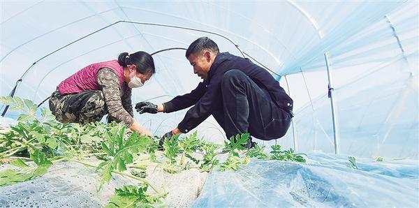 3月15日,在扶溝縣江村鎮(zhèn)江北村現(xiàn)代農業(yè)產業(yè)園的大棚里,農戶在管理西瓜苗。該園區(qū)占地500余畝,主要種植麒麟美都西瓜、太陽花水果玉米、優(yōu)質菠菜,預計每畝年綜合收益1.2萬元,輻射帶動周邊200余名群眾在家門口就業(yè)。