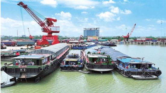 清晨的沙潁河畔,周口港范營作業(yè)區(qū)一派繁忙景象。巍然聳立的橋吊如鋼鐵巨臂,精準(zhǔn)地將五顏六色的集裝箱吊裝至貨輪;