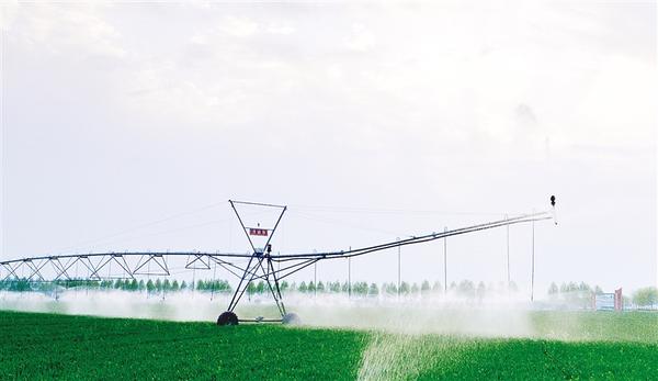 近日,在河南周口國(guó)家農(nóng)高區(qū)鄲城縣高標(biāo)準(zhǔn)農(nóng)田示范區(qū),平移式噴灌機(jī)伸展銀色“臂膀”,將精準(zhǔn)調(diào)配的水肥溶液均勻?yàn)⑾蚓G油油的麥田。
