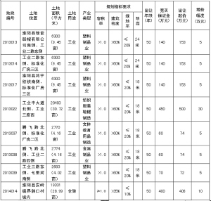 備注:1.2013013、2013014、2013017、2013022、2013037、2013038、2013039宗地位于產(chǎn)業(yè)集聚區(qū)內(nèi),屬兩層以上標(biāo)準(zhǔn)化廠房建設(shè)用地,投資強(qiáng)度≥3750萬(wàn)元/公頃。地上有部分違法建筑物,經(jīng)政府辦、發(fā)改委、財(cái)政局、監(jiān)察局、法制辦、住建局、審計(jì)局、房產(chǎn)辦、規(guī)劃辦、城市綜合執(zhí)法局和縣產(chǎn)業(yè)集聚區(qū)管委會(huì)集體研究,地上建筑不再作價(jià)與土地捆綁出讓,由土地競(jìng)得人無(wú)償處置地上建筑物。土地出讓合同簽訂后,8個(gè)月內(nèi)必須開工建設(shè),工期24個(gè)月,土地成交價(jià)款需在土地出讓合同簽訂后60日內(nèi)繳清,交地時(shí)間在3個(gè)月內(nèi)。