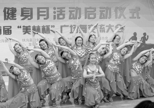 5月10日上午,扶溝縣一女子代表隊在臺上表演舞蹈。當日,扶溝縣2015年健身月啟動儀式暨廣場舞交流大會拉開帷幕。來自全縣各鄉(xiāng)鎮(zhèn)巾幗代表隊依次走上舞臺,展現(xiàn)其優(yōu)美的舞姿。在接下來的一個月里,該縣還將聯(lián)合各類體育協(xié)會在城區(qū)開展武術、跆拳道等體育活動。盧付昌 申蘭霞 攝