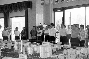 羅文閣在商務(wù)中心區(qū)規(guī)劃沙盤前聽取項(xiàng)目進(jìn)展情況匯報(bào)。丁宇濤 攝