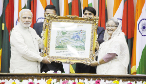 印度和孟加拉國簽署多項(xiàng)文件加強(qiáng)合作 6月6日,在孟加拉國達(dá)卡舉行的新聞發(fā)布會上,孟加拉國總理哈西娜(右)向印度總理莫迪贈送電站項(xiàng)目效果圖。孟加拉國總理哈西娜6日與正在孟加拉國訪問的印度總理莫迪舉行會談,兩國當(dāng)天簽署多項(xiàng)文件加強(qiáng)合作。新華社發(fā)