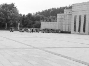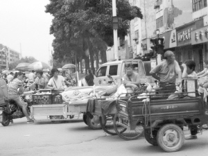 圖①  周口師范學(xué)院大門前又見排成一行的“紅頂三輪車”在從事非法營運(yùn),沒人進(jìn)行管理。